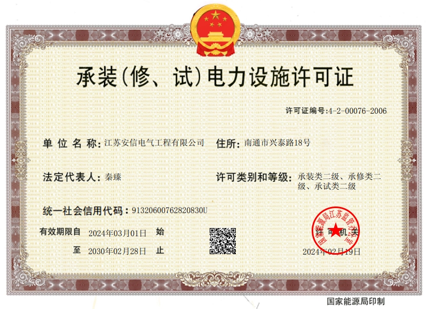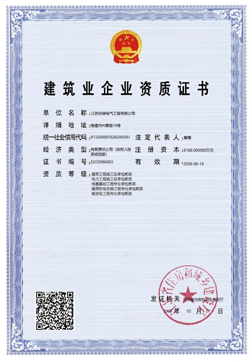 承裝二級、承修二級、承試二級,電力工程施工總承包二級,輸變電工程專業(yè)承包二級,建筑工程施工總承包二級,建筑機電安裝專業(yè)承包二級,地基基礎(chǔ)專業(yè)承包二級